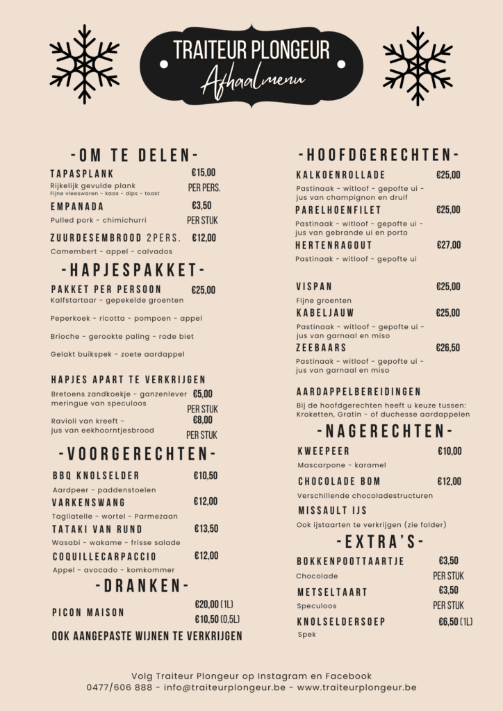 Stuur gerust een mail met uw bestelling naar info@traiteurplongeur.be.